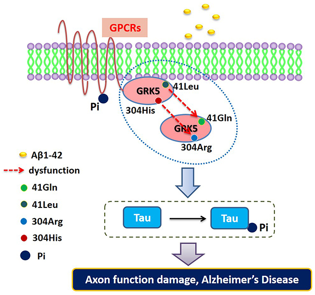 Based on previous studies, we propose a functional mapping for evaluating the impact of the rs2230345 and rs2230349 polymorphisms on GRK5 function and tau phosphorylation. As shown in Figure 5, GRK5-Gln41Leu performed a gain-of-function by enhancing its membrane-binding properties, which serves as a resistance in AD patients. However, the GRK5-Arg304His mutant might function as GRK5 deficiency in vivo, which was more sensible to Aβ. In this vicious cycle, Aβ42 and cholinergic dysfunction each serve as the causes and consequences, whereas GRK5 deficiency amplifies these effects [37]. In addition, it has been reported that the GRK5 dysfunction constitutes a crucial regulatory step for tau hyperphosphorylation by activating GSK3β signaling pathways, another known risk factor for AD [23, 38].