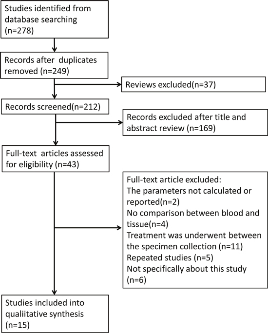 Our search strategy identified 278 publications for consideration. Of these, 29 duplicated studies and 37 reviews were eliminated. Then, 169 were excluded based on review of the titles and abstracts. Of the 43 publications remained, full articles were obtained and reviewed, and another 28 studies were excluded for the following reasons: five were repeated articles; two had too little data to form the 2×2 table; four studies lacked the comparison of EFGR status between blood and tissue; eleven compared pre-treatment tissue and post-treatment blood; and six did not specifically pertain to the subject. (Figure 1) Fifteen publications meeting all of the inclusion criteria were considered for the meta-analysis.