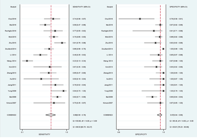 The subgroup with same method applied in both blood and tumor tissue had a poor pooled sensitivity (0.64, 95% CI: 0.53–0.75) than the subgroup with different methods applied in two specimen (0.81, 95% CI: 0.68–0.93)(P = 0.02). No statistically significant differences were found between the pooled specificities of the studies with same method applied in both specimen (0.98, 95% CI: 0.97–0.99) and that of the studies with different method applied in both specimen (0.90, 95% CI: 0.83–0.97) (P = 0.93).