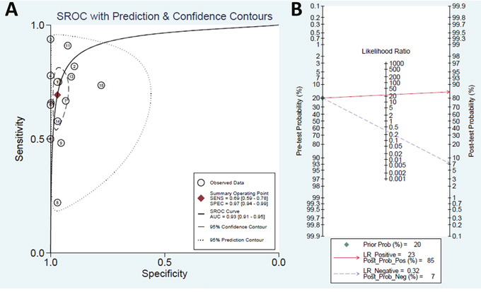 Figure 3: (A) Summary receiver operating characteristics (SROC) plot. It showed a good performance of liquid biopsy in advanced non-small cell lung cancer patients. (B) Fagan plot of the positive likelihood ratio and negative likelihood ratio. The plot showed a good positive likelihood ratio and a moderate negative likelihood ratio.