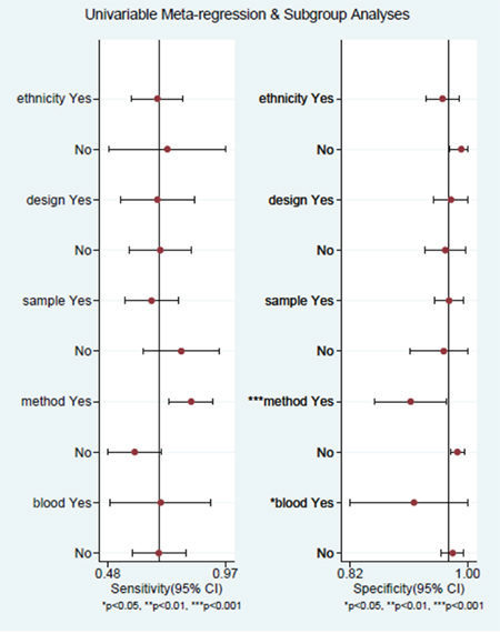 It is important to note that significant heterogeneity exited among the studies analyzed in our work. But there was no threshold effect observed (p=0.09). Furthermore, we conducted meta-regression analysis to explore the source of heterogeneity. We found that the detection method applied in two specimens is responsible for the heterogeneity. In the subgroup analysis, studies with same detection method applied in two specimens had a poor sensitivity than studies with different detection methods applied. The other subgroups, including race, design, sample types or blood amount don’t show significantly different sensitivities or specificities.