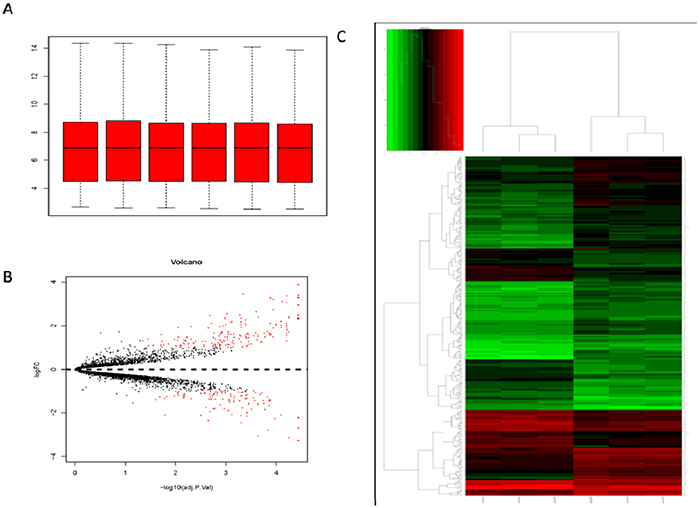 Figure 3: Analysis of DEGs by bioinformatics tools. (A) Cassette figures of data distribution after standardization. The horizontal axis stands for sample names while the vertical axis represents the expression That all the black lines in the figure are almost on the same straight line reveals a good standardization degree. (B) The volcano plot of differentially expressed genes. The abscissa is logFC and the ordinates is -log10 (P Value). The red dots stand for the differentially expressed genes while the black dots represent genes not differentially expressed. (C) Hierarchical cluster dendrogram of DEGs. The horizontal axis represents sample names. GSM629991 GSM629992 and GSM629993 are saline treated wild type mice samples. GSM629994, GSM629995 and GSM629996 are Bleomycin treated wild type mice samples. The left vertical axis shows clusters of DEGs, and the above horizontal axis shows clusters of samples. Red represents up-regulated genes and green represents down-regulated genes.
