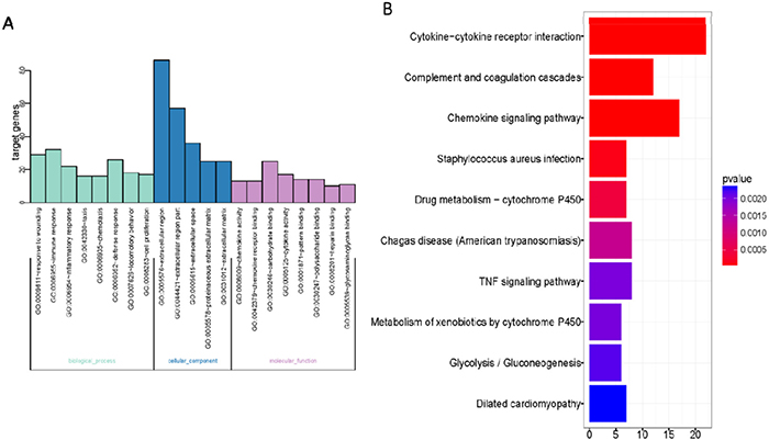 Figure 4: Gene Ontology enrichment analysis. (A) Gene Ontology enrichment of DEGs of Bleomycin treated wild type mice lung samples; (B) KEGG enrichment of DEGs of Bleomycin treated wild type mice lung samples. The horizontal axis represents the number of enriched genes. The vertical axis represents the Gene Ontology or KEGG terms.