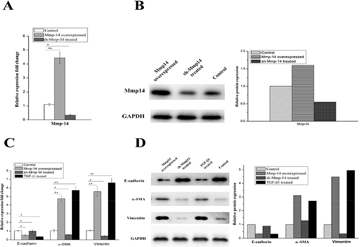 Figure 5: The protein and mRNA expression of Mmp14 in A549 treated with different ways. (A) the mRNA expression of Mmp14 in A549 cell lines was relative to the GAPDH mRNA from the same sample. The experiments were performed three times, and the mean value±SD are presented. (B) Western blotting of Mmp14 in Blank, Mmp14 overexpressed and sh-Mmp14 treated A549. And quantitative analysis of Mmp14 expression in A549 cells under the indicated treatment Overexpression of Mmp14 promotes EMT in A549 cell. mRNA analysis (C) and Immunoblot analysis (D) of Marker proteins (E-cardherin, α-SMA and Vimentin) which were relative to the EMT in the A549 cells treated with Mmp14 overexpressed, sh-Mmp14 and additional TGF-β1 respectively. (The mRNA expression of Mmp14 in A549 cell lines was relative to the GAPDH mRNA from the same sample). All data are expressed as the means±SD of at least three independent experiments.