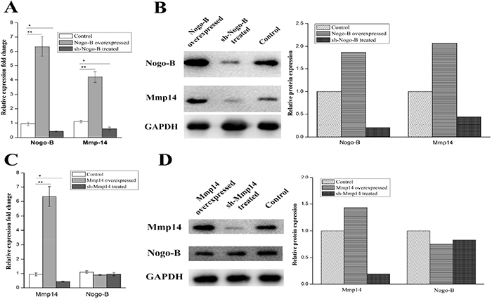 Figure 6: The protein and mRNA expression of the Mmp14 were in line with the up and down regulated Nogo-B in A549 cells. (A) qRT-PCR analysis of Mmp14 and Nogo-B levels in the A549 cells with indicated treatments. All data are expressed as the means±SD of at least three independent experiments. The protein and mRNA expression of the Mmp14 were influenced by the up and down regulated Nogo-b in A549 cells. (B) Western blot analysis of Mmp14 in A549 cells treated with overexpresion and silence of Nogo-B, GAPDH was used as a loading control. (C) qRT-PCR analysis of Mmp14 and Nogo-B levels in the A549 cells with indicated treatments. All data are expressed as the means±SD of at least three independent experiments. (D) Western blot analysis of Nogo-B in A549 cells treated with overexpresion and silence of Mmp14, GAPDH was used as a loading control.