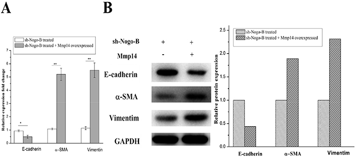 Figure 7: The EMT of the A549 cells with down-regulated Nogo-B were recovered by the up-regulated Mmp14. mRNA analysis (A) and immunoblot analysis (B) of marker proteins (E-cardherin, α-SMA and Vimentin) which were relative to the EMT in the A549 cells treated with Mmp14 overexpressed and Nogo-b knock down.