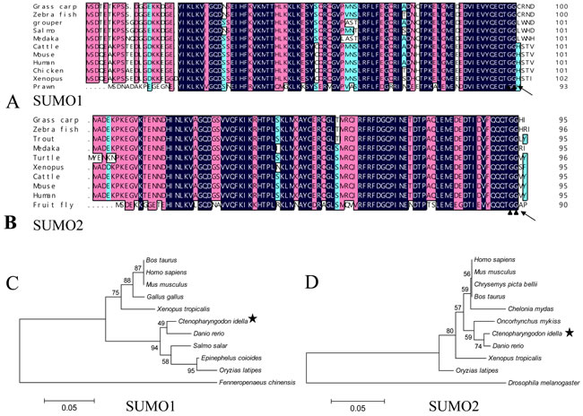 Figure 1: Sequence analysis of grass carp SUMO1 and SUMO2. A. and B. amino acid sequence multi-alignments of SUMO1 and SUMO2 from different organisms; C. and D. the phylogenetic analysis between SUMO1/SUMO2 and their homologues from other organisms. In A and B, the blue (100%), pink (above 75%), and cyan (above 50%) bars indicate the similarity at a specific position; the particular double-Gly motifs are shown by solid triangles; and the predictive cleavage sites are marked using black arrows in the SUMO sequences. Species and accession numbers for SUMO1 proteins: Grass carp [MF106225]; Zebra fish [NM_213159.1]; Grouper [ALR35733.1]; Salmo [BT058601.1]; Medaka [GQ463435.1]; Cattle [AAX09006.1]; Mouse [NP_033486.1]; Human [NP_003343.1];Chicken [NP_989466.1]; Xenopus [Q6DEP7.1]; Prawn [AHE40942.1]; Danio rerio [NM_213159.1]; Bos Taurus [AAX09006.1]; Ctenopharyngodon Idella [MF106225]; Epinephelus coioides [ALR35733.1]; Fenneropenaeus chinensis [AHE40942.1]; Gallus gallus [NP_989466.1]; Homo sapiens [NP_003343.1]; Mus musculus [NP_033486.1]; Oryzias latipes [GQ463435.1]; Salmo salar [BT058601.1]; Xenopus tropicalis Q6DEP7.1. Species and accession numbers for SUMO2 proteins: Grass carp [MF106226]; Zebra fish [NP_001003422.1]; Trout [NP_001158529.1]; Medaka [NP_001165519.1]; Turtle [XP_007065106.1]; Xenopus [NP_001016406.1]; Cattle [NP_777194.1]; Mouse [NP_579932.1]; Human [NM_006937.3]; Fruit fly [NP_477411.1]; Danio rerio [NP_001003422.1]; Ctenopharyngodon Idella [MF106226]; Oncorhynchus mykiss [NP_001158529.1]; Drosophila melanogaster [NP_477411.1]; Chrysemys picta bellii [XP_005297527.1]; Homo sapiens [NM_006937.3]; Mus musculus [NP_579932.1]; Oryzias latipes NP_001165519.1]; Bos Taurus [NP_777194.1; Xenopus tropicalis [NP_001016406.1]; Chelonia mydas [XP_007065106.1].