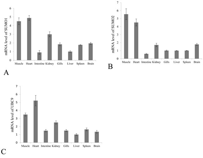 Figure 2: Constitutive tissue distribution of SUMO1, SUMO2 and Ubc9 in grass carp. The mRNA levels of SUMO1 A. SUMO2 B. and Ubc9 C. were measured by real time RT-PCR in the muscle, heart, intestine, kidney, gill, liver, spleen and brain. The relative expression levels of SUMO1, SUMO2 and Ubc9 were normalized to 18S rRNA level and calculated against the expression level in the liver using the 2 -ΔΔCT method. Each tissue was sampled three times from three fish, and fold change are presented as the mean ± SE (n = 3).