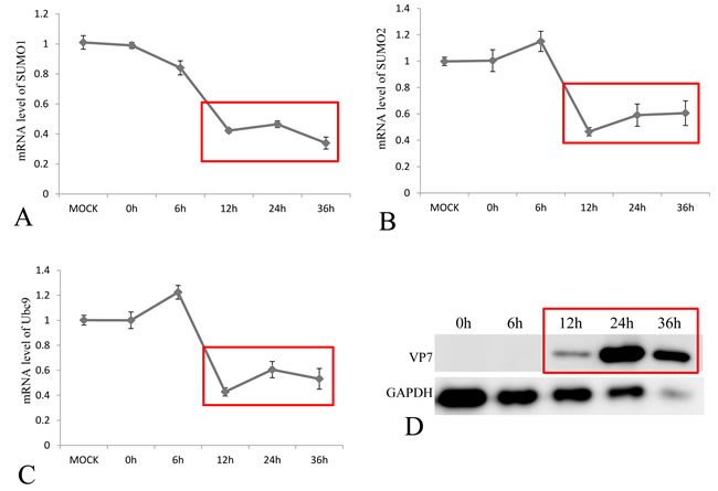 Figure 3: Transcriptional repression of SUMO1, SUMO2 and Ubc9 by GCRV in CIK cells. The CIK cells were infected by GCRV-JX01 at a MOI of 0.1, and the relative mRNA levels of SUMO1 A. SUMO2 B. and Ubc9 C. were determined by real time RT-PCR and normalized to 18S rRNA level and calculated against the expression levels of MOCK group by the 2 -ΔΔCT method. The protein expression of GCRV VP7 was probed by anti-VP7 polyclonal antibody and the GAPDH protein acted as internal control D. The process of viral replication was shown by red rectangles and the time points for sample collection were indicated.