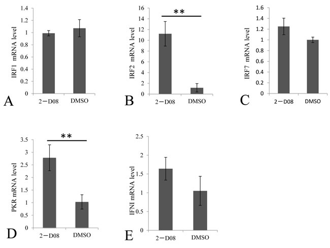 IFN had been reported to regulate over 500 ISGs. Among them, PKR functions to shut down viral protein translation through phosphorylation of Ser51 of the alpha subunit of eIF2 as a defense mechanism against viral infection [23]. In contrast to the IFN-inhibitory regulator IRF2 [11, 19], IRF1, IRF3 and IRF7 are three multifunctional and critical transcription factors essential for the transcription of type 1 IFN [24, 25]. IRF3 and IRF7 belonged to the IRF3 subfamily and they cooperatively regulated the expression of IFN [26]. In this study, IRF2, IRF1, and IRF7 were selected to monitor the expression of interferon regulatory factors; while IFNI was picked for evaluation of IFN response with PKR as a marker for ISGs expression (Figures 6 and 7). One of the most exciting discovery lied in that IRF2 was dramatically induced by 2-D08, which predicted a non-IFN signaling response for the induced PKR (Figure 6). Consistently, IFNI, IRF1, and IRF7 were not stimulated in cells treated with 2-D08, which further validated the existence of non-IFN signaling (Figure 6). It was worth to note that ISGs were generally regulated by many regulators besides IFN, for example, RIG-I had been identified as a key antiviral interferon-stimulated gene against hepatitis E virus regardless of interferon production [27].