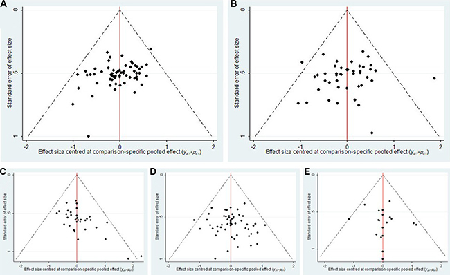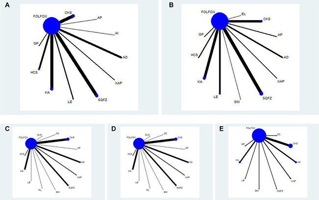 Figure 2: Network graph for 5 outcomes. Note: (A) Clinical efficacy; (B) Performance status; (C) Leucopenia; (D) Gastrointestinal reaction; (E) Hepatic dysfunction; FOLFOX: FOLFOX Chemotherapy regimen; CKS: Compound kushen injection; AP: Astragalus polysaccharide injection; AI: Astragalus injection; AD: Aidi injection; XAP: Xiaoaiping injection; SQFZ: Shenqifuzheng injection; LE: Lentinan injection; KA: Kangai injection; HCS: Huachansu injection; GP: Ginseng Polysacchride Injection; EL: Elemene injection; SM: Shenmai injection; DLS: Delisheng injection; DC: Disodium cantharidinate and vitamin B6 injection; PL: Placenta polypeptide injection.