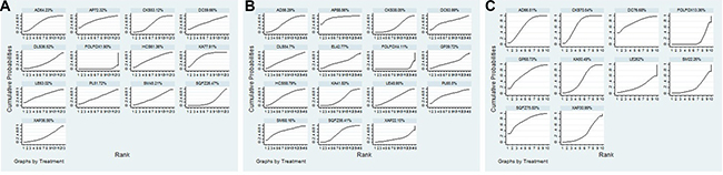 Figure 4: Rank of cumulative probabilities of ADRs. Note: (A) Leucopenia; (B) Gastrointestinal reaction; (C) Hepatic dysfunction; FOLFOX:FOLFOX Chemotherapy regimen; AD: Aidi injection; AP: Astragalus polysaccharide injection; CKS: Compound kushen injection; DC: Disodium cantharidinate and vitamin B6 injection; DLS: Delisheng injection; HCS: Huachansu injection; KA: Kangai injection; LE: Lentinan injection; PL: Placenta polypeptide injection; SM: Shenmai injection; SQFZ: Shenqifuzheng injection; XAP: Xiaoaiping injection; EL: Elemene injection; GP: Ginseng Polysacchride Injection.