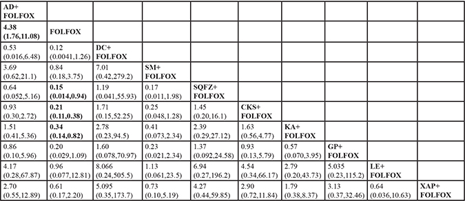 Table 2: Results of the network meta-analysis for leukopenia (upper right quarter), gastrointestinal reaction (lower left quarter)