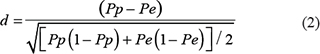 where Pp and Pe denote the proportion of a binary baseline variable in two groups [42]. d values less than 0.1 indicate very small differences between groups; d values between 0.1 and 0.3 indicate small differences; d values between 0.3 and 0.5 indicate moderate differences; and d values greater than 0.5 indicate considerable differences.