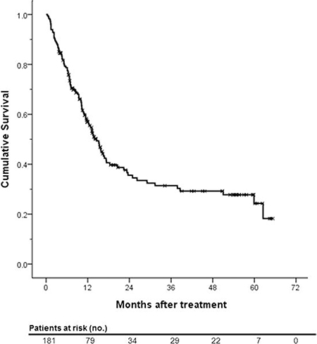 Table 1 lists the baseline characteristics of all 181 patients. The median age was 55 years (range, 28–82 years) and 151 (83.4%) patients were males. The most common etiology of HCC was HBV infection (n = 153, 84.5%). The median radiologic tumor size at diagnosis was 9 cm (range, 2–20 cm), and up to 5 masses were found (median, 1; range, 1–5). The median AFP, albumin, and total bilirubin levels were 1444 ng/mL (range, 0.34–120000 ng/mL), 3.9 g/dL (range, 2.0–4.9 g/dL), and 0.9 mg/dL (range, 0.3–28.3 mg/dL), respectively. In total, 159 (87.8%) patients with preserved liver function were in Child-Pugh class A and 22 (12.2%) patients were in Child-Pugh class B. Sixty-three (34.8%) patients were BCLC stage B and 118 (65.2%) patients were BCLC stage C. Approximately 60.8% of patients had vascular invasion at diagnosis. Although 42 (23.2%) patients were treated with HAIC only, most patients (139, 76.8%) were treated with HAIC and CRT.