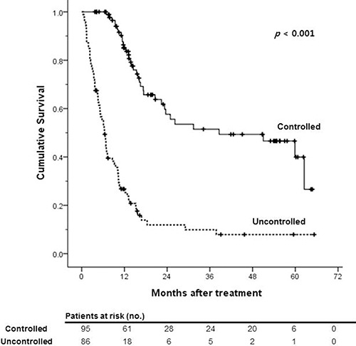 The median follow-up period was 11.1 months (range, 0.4–65.3 months). During this period, 107 (59.1%) patients died. the 1-, 3- and 5- year survival rates were 57.0%, 31.4%, and 24.3%, respectively (Figure 1). Treatment response of HAIC with or without CRT is summarized in Table 2. 69 patients (38.1%) showed partial response (PR), 50 patients showed stable disease (SD) and 50 (27.6%) patients showed disease progression (PD). Among all subjects, 38.1% of patients experienced the objective response and disease control rate was 52.5%. The median OS was significantly lower in uncontrolled patients than patients who achieved disease control after HAIC with or without CRT (6.4 months versus 38.6 months, p < 0.001; Figure 2).