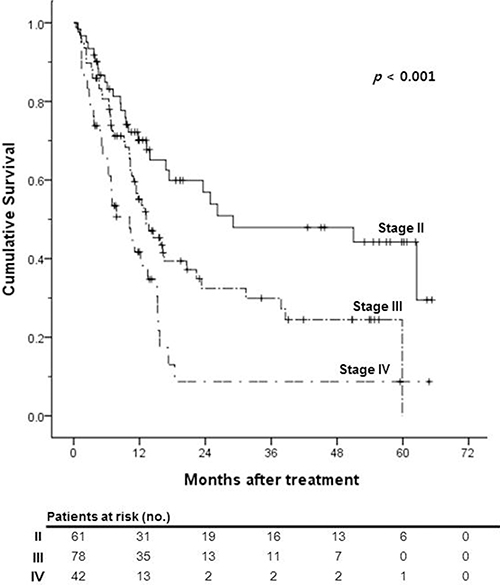 All statistical analyses were performed using SPSS for windows version 23.0 (SPSS Inc., Chicago, IL, USA). Student’s t-test was used to compare continuous variables, and the chi-square or Fisher’s exact test was used for categorical variables. Overall survival (OS) was computed from the day treatment began until the most recent follow-up or death. Survival time and rate were estimated by the Kaplan-Meier method, and differences between groups were assessed using the log-rank test. A P value < 0.05 was considered statistically significant.