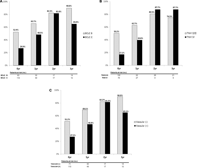 Both BCLC stage B and C patients tended to have an increased 2-year CS. The 2-year CS of 0, 1, 2, and 3 years in BLCL stage B patients was 52.4%, 65.7%, 82.3%, and 90.0%, respectively, and that in BCLC stage C patients was 26.9%, 48.5%, 81.8%, and 65.0%, respectively (Figure 4A). Standardized differences in the 2-year CS between BCLC B and C groups revealed a tendency to decrease. Standardized differences at 0, 1, 2, and 3 years were 0.54, 0.35, 0.01, and 0.63, respectively, indicating that the BCLC stage of patients at diagnosis does not affect patient survival more than 2 years after treatment. Other factors that reflect tumor aggressiveness, such as TNM stage and the presence of vascular invasion, had a similar tendency to BCLC stage (Figure 4B and 4C). For example, the 2-year CS rates of patients in TNM stage II/III were higher than 20% compared with stage IV patients at 1 year after treatment (62.7% versus 39.8%; d = 0.47). However, after 2 years, the CS rate was similar between the two groups and standardized differences were lower than that at 1 year after treatment (d = −0.20 and −0.34 at 2 and 3 years after treatment, respectively).