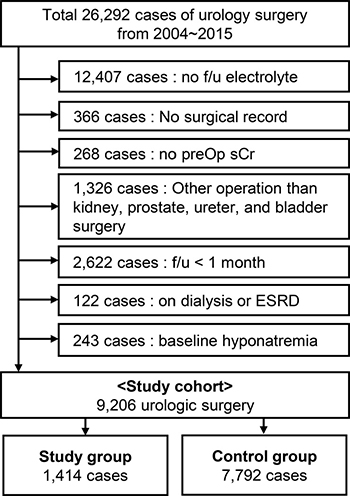 The study was a retrospective cohort study including patients from two tertiary hospitals in Korea. The inclusion criteria were bladder, prostate, ureter, and kidney surgery cases performed in the urologic department, with patients aged ≥ 18 years and available postoperative follow-up serum Na level within 7 days. The following patients were excluded from the study: 1) those with preexisting ESRD; 2) with no preoperative sCr within 1 month; 3) with no documented surgical record; 4) other urology surgeries than the four major categories identified in this study or complex operation cases involving multiple organs, 5) those lost to follow up less than 1 month post-operation due to causes other than death or the start of RRT, and 6) patients who had baseline hyponatremia. The study group consisted of patients with newly developed postoperative hyponatremia, defined as at least one serum sodium level lower than 135 mEq/L within 7 days after surgery, and the others were included in the control group.