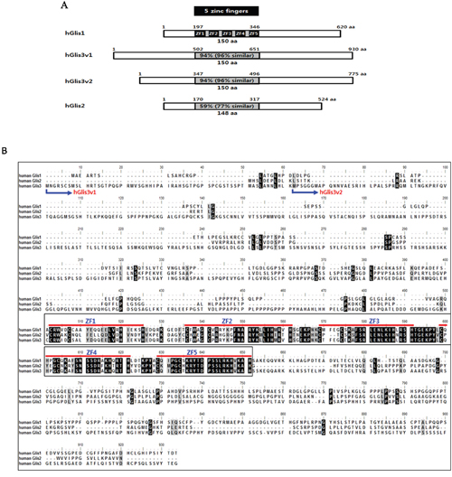 Figure 1: Sequence comparisons of the human Glis family proteins. (A) The amino acid sequence homologies among hGlis proteins are shown in the 5 zinc finger-containing DNA-binding domains (grey box). The 5 black boxes in the DNA-binding domain of hGlis1 indicate zinc finger sequences. (B) The amino sequences of the hGlis proteins were aligned. Perfectly matched amino acids among hGlis1, 2 and 3 are represented by black boxes, and the amino acid positions with one mismatch among the hGlis proteins are marked in grey. The 5 red lines in the middle of the entire sequences indicate the 5 zinc finger sequences (ZF1-5). The N-terminal amino acids of the two variants of hGlis3 (hGlis3v1 and hGlis3v2) are marked at the beginning of the entire amino acid sequences.
