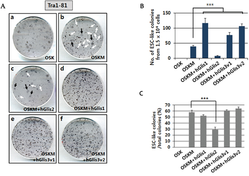 Figure 2: Comparison of the reprogramming activities of Glis proteins. (A) The reprogramming efficiencies of the Glis proteins were compared by counting the number of ESC-like (iPSC) colonies generated after staining with the pluripotency marker Tra1-80. Immunostaining was performed at day 21 post-transduction of the hADSCs with the transgene-expressing retroviruses. Two different forms of colonies were detected, including ESC-like colonies with a clear boundary (i.e., white arrows in Figure 2A, b & c) and transformed cell colonies (i.e., black arrows in Figure 2A, b & c). (B) The number of ESC-like colonies formed from 1.5 x 104 hADSCs is indicated in the graph. n = 3, ***p<0.001. (C) The percentage of ESC-like colonies among the total colonies (both ESC-like and transformed cell colonies) is shown in the graph. n = 3, ***p<0.001.