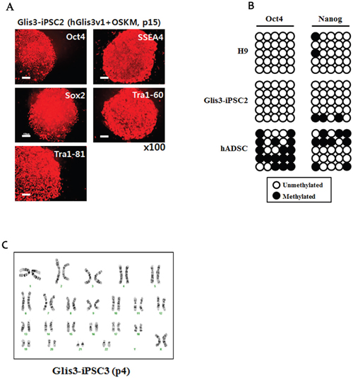Figure 3: Characterization of Glis3-iPSCs generated by 4 Yamanaka factors and hGlis3v1. (A) Immunostaining of the Glis3-iPSC2 line (at passage 15) was performed using antibodies recognizing undifferentiated pluripotent cell markers, such as Oct4, SSEA4, Sox2, Tra1-60, and Tra1-81. Scale bar: 100 μm. (B) DNA methylation patterns of the promoters of Oct4 and Nanog were compared among H9-hESCs, the Glis3-iPSC2 cell line, and hADSCs. The black circles indicate methylated CpG sites, and the white circles show unmethylated CpG sites. (C) The presence of chromosome abnormalities in the Glis3-iPSC3 cell line was examined using G-banding analysis.