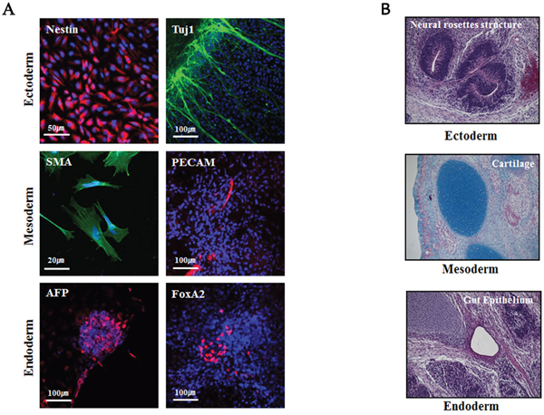 Figure 5: Pluripotency analysis of iPSCs. (A) Immunostaining of representative markers of the three germ layers for the analysis of pluripotency following in vitro differentiation of Glis3-iPSCs. The iPSCs spontaneously differentiated, and the expression levels of representative markers of the ectoderm (Nestin, Tuj1), mesoderm (smooth muscle actin (SMA), PECAM), and endoderm (a-fetoprotein (AFP), FoxA2) lineages were examined using immunocytometry. (B) To perform the in vivo pluripotency analysis, the derivatives of the three germ layers were detected in teratomas at approximately 10 weeks after iPSC administration (2 x 106 cells) into NOD/SCID mice; n = 3.