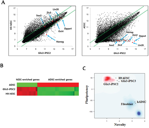 Figure 6: Genome-wide gene expression profiling of Glis3-iPSCs. (A) Scatterplot analysis showed that the global gene expression pattern of Glis3-iPSCs was similar to that of H9-hESCs. However, the gene expression patterns were clearly different between Glis3-iPSCs and their parental cells, i.e., hADSCs. (B) Heatmap analysis indicated that the expression patterns of 80 hESC-enriched genes (Supplementary Table 5) and 96 hADSC-enriched genes (Supplementary Table 6) in Glis3-iPSCs were similar to those in H9-hESCs but different from those in hADSCs. (C) PluriTest, a gene expression-based bioinformatics diagnostic test for evaluating pluripotency [18], showed that the two Glis3-iPSC lines (Glis3-iPSC2 and Glis3-iPSC3) were indeed fully reprogrammed pluripotent stem cells.