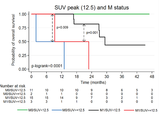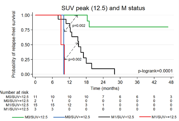 Kaplan–Meier curves of PFS according to FDG-PET/CT-SUVpeak measurement at baseline and disease stage are depicted in Figure 3. All metastatic patients with SUVpeak≥12.5 relapsed or progressed during the first 12 months of follow-up. Conversely, patients with SUVpeak<12.5 had a 1-year PFS survival of 86% (p=0.002). In the non-metastatic sub-group of patients, all patients with SUVpeak≥12.5 relapsed or progressed during the first 12 months of follow-up, while those with SUVpeak<12.5 had 2-years PFS survival of 80% (p=0.002).