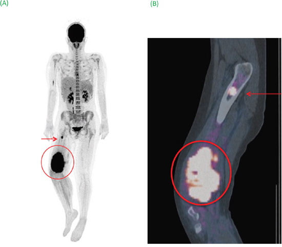 Figure 2: (A) Maximum image projection (MIP) showed the primary tumor surrounded associated with bone metastatic site (arrow). (B) Sagittal fusion FDG-PET/CT image specified lesions’ anatomical locations. Semi-quantitative PET parameters of the primary tumor (SUVmax of 29 and SUVpeak of 20.57) were associated with a poor prognosis (OS: 9 months).