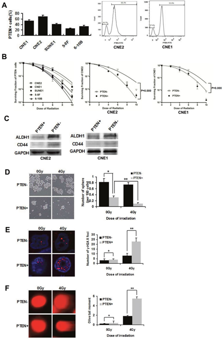 Figure 1: PTEN− cells are capable of self-renewal and are resistant to radiation. (A) Expression levels of PTEN+ cells in five NPC cell lines. CNE2 and CNE1 cells were stained with PTEN antibody, and analyzed by flow cytometry. Two populations can be distinguished based on PTEN fluorescence: PTEN−/CNE2 18.7% and PTEN+/CNE2 68.4%, PTEN−/CNE1 36.4% and PTEN+/CNE1 53.8%. (B) PTEN- cells in five NPC cell lines CNE2, CNE1, SUNE1, 5-8F and 6-10B were irradiated with 0, 2, 4, 6, 8 or 10 Gy and a colony formation assay was conducted (Left). Survival curves of PTEN−/+ CNE2 and PTEN−/+ CNE1 cells (middle and right). (C) Western blot analysis of the expression of ALDH1 and CD44 in PTEN−/+ CNE2 and CNE1 cells. (D) Tumorsphere formation in PTEN− and PTEN+ irradiated CNE2 cells cultivated in serum-free medium for 72 h. * and ** indicate P < 0.01. (E) PTEN− and PTEN+ CNE2 cells were sorted directly onto glass slides following irradiation at 0Gy or 4 Gy and immunostained with anti-γ-H2AX (red). Nuclei were stained with DAPI (blue). There were significantly more DNA-damaged foci in the PTEN+ population. * indicates P > 0.05, ** indicates P < 0.01. (F) Detection of DNA damage of PTEN− and PTEN+ irradiated CNE2 cells by comet assay. * indicates P > 0.05, ** indicates P < 0.01. Data are shown as mean ± S.D of three independent experiments.