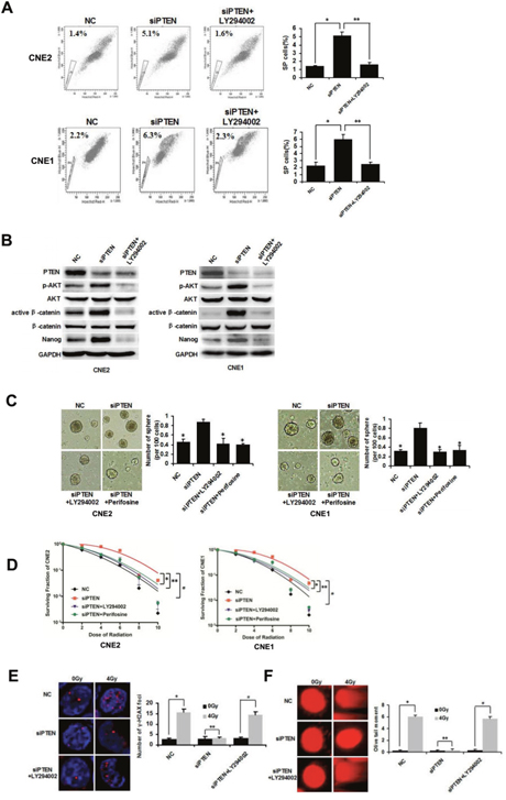 Figure 2: PTEN regulates CSCs and radioresistance through the PI3K/AKT/β-catenin pathway. (A) CNE2 and CNE1 cells were transfected with NC or siRNA targeting PTEN. FACS analysis of SP cells in NC, siPTEN and siPTEN+LY294002 CNE2 and CNE1 cells. * and ** indicate P < 0.01, vs. siPTEN group. (B) Western blot analysis of the expression of PTEN, AKT, p-AKT, β-catenin, active β-catenin and Nanog in NC, siPTEN and siPTEN+LY294002 CNE2 and CNE1 cells. (C) Tumorsphere formation in NC, siPTEN, siPTEN+LY294002 and siPTEN+Perifosine CNE2 and CNE1 cells cultivated in serum-free medium for 72 h. * indicates P < 0.01, vs. siPTEN group. (D) Survival curves of NC, siPTEN, siPTEN+LY294002 and siPTEN+Perifosine CNE2 and CNE1 cells.*, ** and # indicate P < 0.01, vs. siPTEN group. (E) NC, siPTEN and siPTEN+LY294002 CNE2 cells were sorted directly onto glass slides following irradiation at 0Gy or 4 Gy and immunostained with anti-γ-H2AX (red). Nuclei were stained with DAPI (blue). * and # indicate P < 0.01, ** indicates P > 0.05. (F) Detection of DNA damage of NC, siPTEN and siPTEN+LY294002 CNE2 cells by comet assay. * and # indicate P < 0.01, ** indicates P > 0.05. Data are shown as mean ± S.D of three independent experiments.