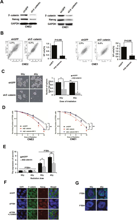 Figure 3: β-catenin nuclear accumulation is involved in mediating NPC CSCs and radioresistance. (A) β-catenin was knocked down with lentivirus-mediated shRNA in CNE2 and CNE1 cells. Western blot analysis of the expression of β-catenin and Nanog. (B) FACS analysis of SP cells in shGFP and shβ-catenin CNE2 and CNE1 cells. (C) Tumorsphere formation of irradiated PTEN− cells in shGFP and shβ-catenin CNE2 cells cultivated in serum-free medium for 72 h. (D) Survival curves of PTEN- cells in shGFP, shβ-catenin and shβ-catenin+IGF-1 CNE2 and CNE1 cells. (E) shGFP and shβ-catenin CNE2 cells were irradiated at 0 Gy and 4 Gy. After 24 h the irradiated cells were sorted into PTEN− and PTEN+ populations. The expression of survivin was determined by qPCR analysis. * and ** indicate P < 0.05. (F) In shGFP control CNE2 cells, β-catenin was mainly located in cytoplasmic membranes. Inhibition of β-catenin resulted in increased β-catenin nuclear staining, which was reversed by LY294002 (15 μM). (G) Immunofluorescence of active β-catenin in PTEN− and PTEN+ cells after 0 Gy and 4 Gy irradiation. β-catenin is shown in green, and the nuclei are stained with DAPI (blue). Images were captured by confocal microscopy.