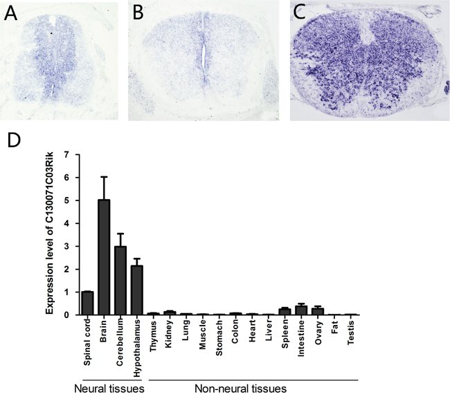 Figure 1: Mouse lncRNA C130071C03Rik is specifically expressed in neural stem cells during development and highly enriched in neural tissues in adults. The expression of C130071C03Rik was detected in mouse spinal cord at E11.5 (A), E13.5 (B), and P0 (C) by in situ hybridization. (D) Relative expression levels of C130071C03Rik in different mouse tissues/organs were measured by real-time PCR at P60. The average expression level of C130071C03Rik in the spinal cord was set as 1. Data are presented as mean ± SEM.
