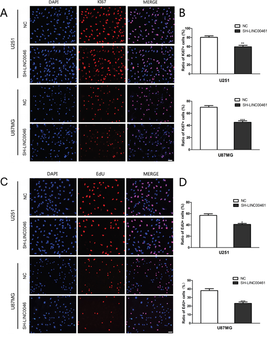 Figure 4: LINC00461 knockdown inhibited cell proliferation. (A) Images of U251 and U87MG cells stained with the antibody against ki67. (B) Histograms showing ratios of proliferating ki67 positive cells. (C) Cell proliferation was measured by EdU assay in U251 and U87MG cells. (D) Histograms showing ratios of EdU positive cells. Data are presented as mean ± SEM. *, P < 0.05; **, P < 0.01; ***, P < 0.001. Scale bar: 50 μm.