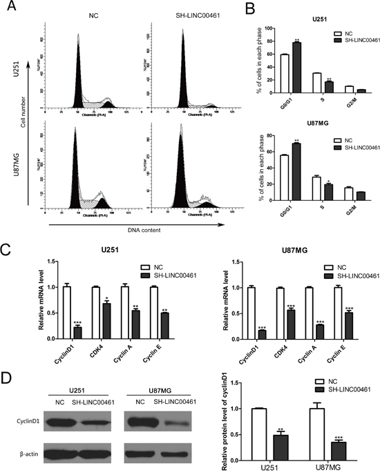 Figure 5: The knockdown of LINC00461 caused G0/G1 phase arrest and reduced expression of cyclins and CDK4. (A) After lentivirus infection, cell cycle distribution was analyzed by flow cytometry. (B) Histograms showing cell cycle phase distribution of both cells. (C) Expression levels of cyclinD1, CDK4, cyclin A and cyclin E mRNAs were measured by real-time PCR. (D) Expression levels of cyclinD1 protein were analyzed by the Western blotting. Histograms showed the quantization of Western blots (normalized by β-actin expression). Data are presented as mean ± SEM. *, P < 0.05; **, P < 0.01; ***, P < 0.001.