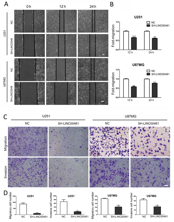 Figure 6: Down-regulation of LINC00461 inhibited cell migration and invasion. (A) The wound healing assay showed delayed gap closure in LINC00461 knockdown cells compared with that in control cells at 12 h and 24 h time points in U251 and U87MG cells. (B) Wound gaps were analyzed by measuring the distance of migrating cells. The migrating distance by control cells is set as 1. (C) Representative images of Transwell assay showing the effect of LINC00461 knockdown on cell migration and invasion. (D) Histograms showing numbers of migratory and invasive cells. Data are presented as mean ± SEM. *, P < 0.05; **, P < 0.01; ***, P < 0.001. Scale bar: 100 μm.