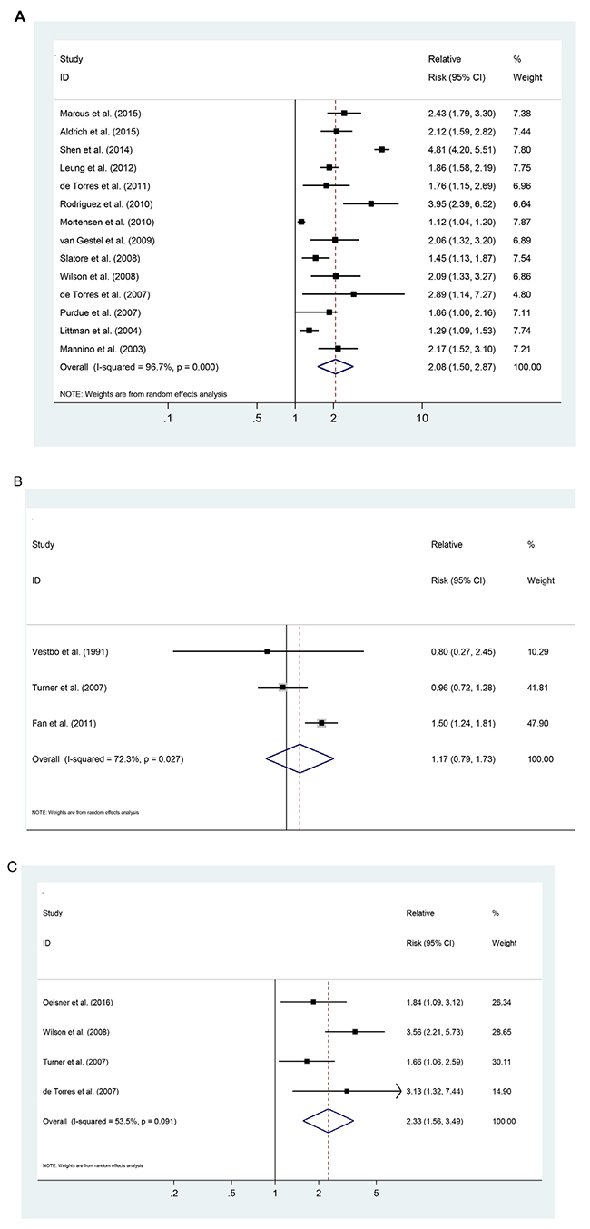 Third, because of the observational nature of our analysis, unmeasured and residual confounding is likely to be present. It has been debated that the COPD-lung cancer relationship may be a product of residual confounding by tobacco smoking, the shared risk factor for both COPD and lung cancer [44]. In our meta-analysis, we included only studies that controlled for the effects of smoking (status, intensity and duration). We further performed analyses according to smoking status, and found that the increased COPD-lung cancer association was independent of smoking status and the magnitude of the association was similar between never and ever smoking. Additionally, some confounding factors were not considered, such as biofuel smoke and second hand smoke (SHS), which is a shared risk factor for lung cancer [59] and COPD [60].