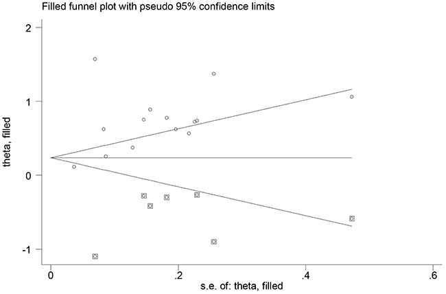 Finally, the possibility of publication bias is of a concern, because small studies with null results tend not to be published. Although Begg’s and Egger’s tests did not reveal evidence of publication bias, visual inspection of the funnel plots did reveal significant asymmetry. The trim-and-fill method suggested 7 additional risk estimates were needed to balance the funnel plot, and the summary risk estimates were still statistically significant, albeit weaker (SRR =1.37).