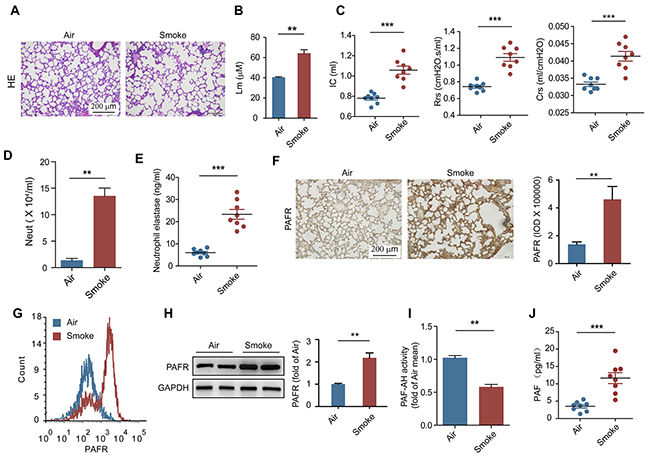 Chronic obstructive pulmonary disease (COPD) is one of the most common respiratory diseases that threaten the lives of the patients [1]. The most classic pathologic features of COPD are pulmonary emphysema caused by the irreversible destruction of the alveoli and airway obstructions caused by airway inflammation and remodeling (e.g. airway fibrosis) [2]. Generally, persistent and repeated injury of the alveolar epithelium and inflammation caused by inhaled insults such as cigarette smoke (CS) are the most important driving forces for the development of COPD [3]. Moreover, the immune microenvironment of the lung tissue which is maintained by neutrophils, macrophages, lymphocytes, epithelial cells and fibroblasts also promotes the progression of this disease [4, 5]. Indeed, several studies demonstrated that the numbers of immune cells are increased in the airway lumen in patients with COPD [5]. CS and other inhaled insults in the airway stimulate resident macrophages and epithelial cells to release large quantity of chemokines, which recruit neutrophils, monocytes and lymphocytes into the damaged tissue [6, 7]. Neutrophils are the key cells in innate immune system which can remove pathogens through phagocytosis and degranulation. An increase in airway neutrophil recruitment can be observed during COPD exacerbation, and the amount of neutrophils correlate with the decline of lung function [8]. In the lung, neutrophils secrete elastase, cathepsin G and proteinase-3 followed by cigarette smoke stimulation, which contribute to alveolar destruction [9]. In addition, a significantly increased number of apoptotic neutrophils have been found in sputum from COPD patients [10], and these dead neutrophils are important source of neutrophil elastase (NE). On the other hand, CS induces inflammation and oxidative stress through activating various receptors on cells. Platelet-activating factor receptor (PAFR) is a G-protein-coupled receptor that may be involved in the pathogenesis of COPD. It has been reported that the expression of PAFR is increased in airway epithelial cells from COPD patients [11, 12], and that CS exposure can promote the production of platelet-activating factor (PAF) [13]. In addition, PAF can facilitate the adhesive function of neutrophils, and has the potential to promote neutrophil recruitment [14, 15]. Nevertheless, whether neutrophil participates in CS-induced COPD through PAFR remains unknown.