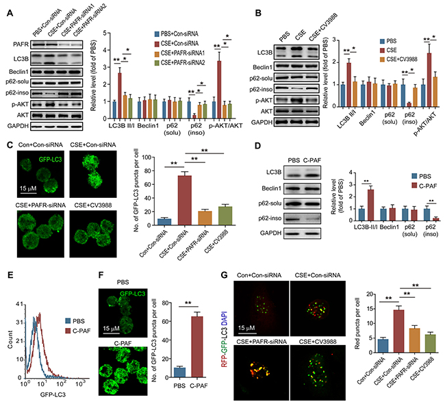 It has been confirmed that CS can induce autophagy in lung epithelial cells, fibroblasts and macrophages [22, 29]. We found that the ratios of LC3B-II/I level, as well as the expression of Atg5 and beclin1, were increased in lung tissue from COPD mice (Figure 2A). As a marker of autophagic flux, p62 is involved in the degradation of unfolded or misfolded proteins in cells, and the content of insoluble p62 is an indicator of autophagy activation [30]. We observed that the amount of insoluble p62 but not soluble p62 was significantly decreased in lung tissue after CS exposure, suggesting that CS activates autophagy in lung tissue (Figure 2A). We then isolated the neutrophils in BALF from control and COPD mice to observe the autophagy activity in these cells. Interestingly, inconsistent with the increment of LC3B-II level and reduction of insoluble p62 amount, the beclin1 level in neutrophils from BALF was not changed after CS exposure (Figure 2B), indicating that CS-induced autophagy in neutrophils is independent of enhancing beclin1 expression. To determine the mechanism of CS-induced autophagy in neutrophils, neutrophils were isolated from bone marrow (BM) of C57BL/6 mice, and treated with different concentrations of CSE. CSE stimulation increased the ratio of LC3B-II/I, and reduced the amount of insoluble p62 in a concentration-dependent manner, but the beclin1 expression was not enhanced after CSE treatment (Figure 2C). As the cellular energy metabolism signals, the PI3K/AKT/mTOR pathway negatively regulates the activity of autophagy [31]. However, CSE significantly increased the ratio of p-AKT/AKT in neutrophils without changing the ratio of p-mTOR/mTOR and p-S6K/S6K, which suggests that CSE triggered autophagy is not dependent on activation of this upstream signaling (Figure 2C). Using GFP-LC3 plasmid, we found that CSE promoted the formation of autophagosome in neutrophils (Figure 2D). Knockdown PAFR or treatment of the cells with PAFR inhibitor CV3988 suppressed the CSE-induced LC3B-I to LC3B-II conversion, reduced the phosphorylation of AKT, and increased the insoluble p62 expression (Figure 3A and 3B). Using immunofluorescence technology, we found that silencing or inhibiting PAFR decreased LC3 fluorescent punctas in autophagosomes in neutrophils after CSE stimulation (Figure 3C). Moreover, activation of PAFR with C-PAF induced autophagy in neutrophils as indicated by the reduction of insoluble p62 content and the formation of autophagosome (Figure 3D-3F). To further verify whether CSE could induce autophagic flux in neutrophils, the flux rate of autophagy was evaluated using mRFP-GFP-LC3 adenovirus [32]. CSE treatment increased red punctas in neutrophils, suggesting CSE enhances autophagic flux in these cells. In contrast, silencing or inhibiting PAFR blocked CSE-induced autophagy as indicated by an increase in yellow punctas in neutrophils (Figure 3G). These data indicate that PAFR mediates CS-induced autophagy in neutrophils.