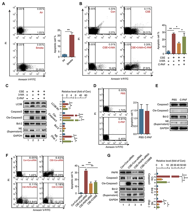 Figure 4: PAFR mediates CSE induced neutrophil death through autophagy. (A) The number of apoptotic neutrophils in BALF from COPD mice was detected with flow cytometry (n = 6). (B) The number of apoptotic neutrophils from bone marrow (BM) was detected with flow cytometry after treatment with 5% CSE, 3-MA (10 mM), or/and C-PAF (5 μg/ml) for 24 hr (n = 3). (C) The expression of LC3B, apoptosis related proteins in BM neutrophils, and neutrophil elastase in the culture supernatant were detected with Western blot after treatment with 5% CSE, 3-MA (10 mM), or/and C-PAF (5 μg/ml) for 24 hr. Data are representative immunoblots and the ratios of the indicated protein to GAPDH (n = 3). (D) The number of apoptotic BM neutrophils was detected with flow cytometry after C-PAF (5 μg/ml) stimulation for 24 hr (n = 3). (E) The expression of apoptosis related proteins in BM neutrophils and neutrophil elastase in the culture supernatant were analyzed with Western blot after C-PAF (5 μg/ml) stimulation for 24 hr (n = 3). (F) The number of apoptotic BM neutrophils was detected with flow cytometry after 5% CSE exposure and indicated treatments for 24 hr (n = 3). (G) The expression of apoptosis related proteins in BM neutrophils and neutrophil elastase in the culture supernatant were detected with Western blot after CSE exposure and indicated treatments. Data are representative immunoblots and the ratios of the indicated protein to GAPDH (n = 3). Data are mean ± SEM. Statistical significance between two groups was determined by student t test; statistical significances among groups were determined by one-way ANOVA test; *P < 0.05, **P < 0.01, ***P < 0.001.