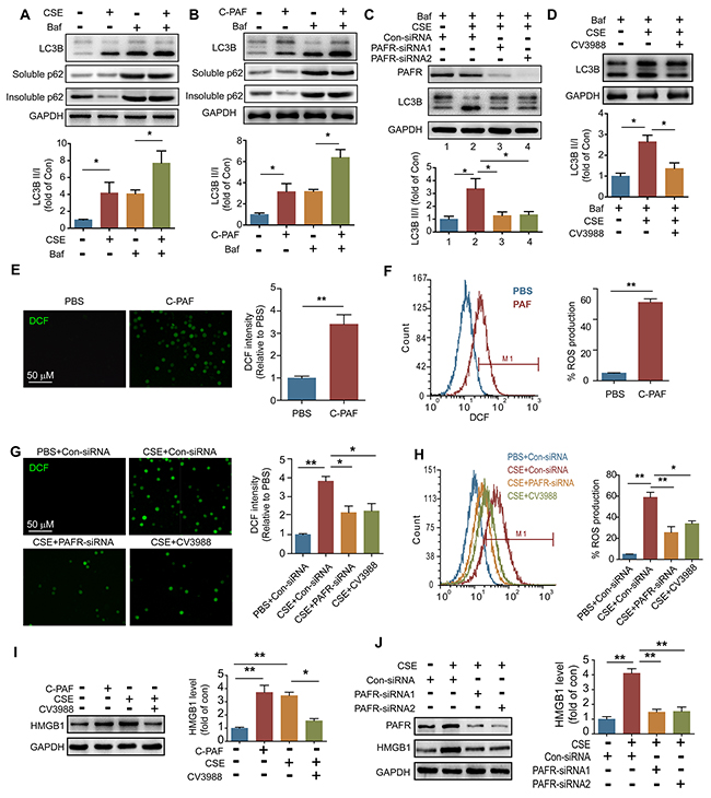 Figure 5: CS exposure increases ROS production in neutrophils. (A and B) BM neutrophils were treated with 5% CSE (A), C-PAF (5 μg/ml) (B), or/and bafilomycin A1 (100 nM) for 12 hr, and the expression of LC3B and p62 was detected with Western blot. Data are representative immunoblots and the ratios of the indicated protein to GAPDH (n = 3). (C) LC3B level was detected with Western blot in PAFR-silenced BM neutrophils after indicated treatment (n = 3). (D) LC3B level was detected with Western blot in BM neutrophils after treatment with bafilomycin A1 (100 nM), 5% CSE, and CV3988 (30 μM) for 12 hr (n = 3). (E and F) BM neutrophils were treated with C-PAF (5 μg/ml) for 24 hr, and the ROS level was analyzed with immunofluorescence stain (E) and flow cytometry (F) (n = 3). (G and H) ROS production in BM neutrophils was evaluated with immunofluorescence stain (G) and flow cytometry (H) after indicated treatments. (I) The expression of HMGB1 was detected in BM neutrophils with Western blot after indicated treatments. Data are representative immunoblots and the ratios of the indicated protein to GAPDH (n = 3). (J) Con-siRNA or PAFR-siRNA transfected BM neutrophils were treated with 5% CSE for 24 hr, and the HMGB1 level was analyzed with Western blot. Data are representative immunoblots and the ratios of the indicated protein to GAPDH (n = 3). Data are mean ± SEM. Statistical significance between two groups was determined by student t test; statistical significances among groups were determined by one-way ANOVA test; *P < 0.05, **P < 0.01, ***P < 0.001.