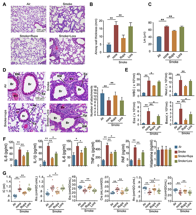 Figure 7: Rupatadine ameliorates CS induced COPD in mice. (A-D) Mice were exposed with CS for 16 weeks, and were treated with rupatadine or loratadine (qd, ig) during the last 4 weeks of CS exposure. H&E-staining (A), airway wall thickness (B), the mean linear intercept of lung tissue (C), and number of alveolar attachments (D) were detected to evaluate the pathologic change of COPD in mice (Br: bronchia, BM: basement membrane, BV: blood vessel, Ep: epithelial cell) (n = 20). (E) The number of inflammatory cells was detected in BALF from the mice with the indicated treatment (n = 8). (F) The levels of IL-8, IL-1β, IL-6, TNF-α, PAF, and Histamine in BALF from the mice with the indicated treatment were evaluated with ELISA (n = 6). (G) Lung function of the mice was evaluated after 16 weeks CS exposure (n = 20). Data are mean ± SEM. Statistical significances among groups were determined by one-way ANOVA test; *P < 0.05, **P < 0.01, ***P < 0.001.