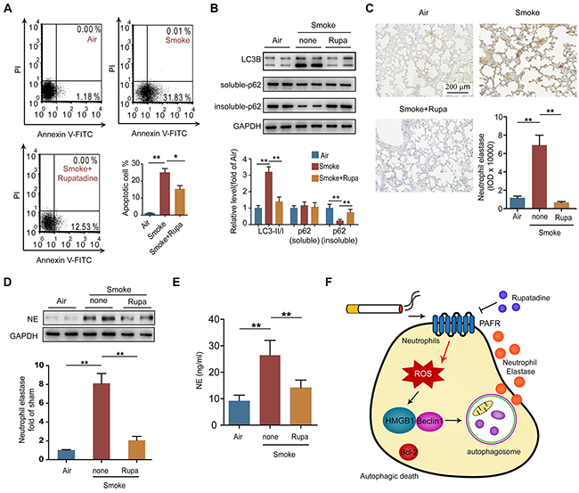 To verify whether PAFR could be a therapeutic target for the treatment of COPD, we observed the effects of rupatadine, a prescription dual antagonist for PAFR and histamine1 receptor (H1R), in mouse model of CS-induced COPD. H1R inhibitor loratadine was used as a control. Rupatadine, but not loratadine treatment significantly attenuated the enlargement of alveolar space (Figure 7A), reduced the airway wall thickness (Figure 7B) and mean linear intercept (Figure 7C), increased the number of alveolar attachments in the lung tissue from cigarette smoke exposed mice (Figure 7D). The number of white blood cells, neutrophils, eosinophils, and basophils were significantly reduced in BALF from rupatadine treated COPD mice; however, loratadine only decreased the counts of eosinophils and basophils (Figure 7E). Similarly, inhibiting PAFR by rupatadine significantly reduced the content of IL-8, IL-1β, TNF-α, and PAF in BALF from smoke exposed mice (Figure 7F). Lung function is a good standard for evaluating the progression of COPD both in clinic and pre-clinical studies. Rupatadine treatment reduced the inspiratory capacity, lung resistance, lung compliance, and increased lung elasticity, airway resistance (Rn), and tissue elasticity (H) of CS-exposed mice, suggesting rupatadine inhibits the small airway destruction and emphysema (Figure 7G). However, the improvement effect of loratadine on lung function was very limited (Figure 7G). As expected, the autophagic death ratio of neutrophils in BALF was decreased after inhibiting PAFR, which was indicated by Annexin V and PI staining, LC3B-II/I ratio, and the amount of insoluble p62 level (Figure 8A and 8B). In consistent with this finding, the NE levels in lung tissue and in BALF were reduced in CS-exposed mice treated with rupatadine (Figure 8C-8E). These results suggest that rupatadine is a promising medicine for the treatment of patients with COPD (Figure 8F).