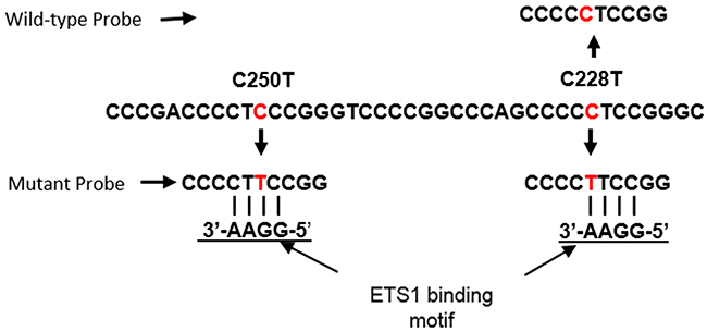 Figure 1: Location of ddPCR assay probes relative to ETS1 binding motifs generated by the C228T and C250T TERT promoter mutations. Probes for the identification of wild-type and mutant sequences are indicated. Both mutant sites are detected by the same probe.
