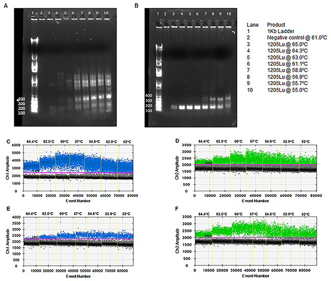 Figure 2: Optimization of ddPCR for detection of TERT promoter mutations. PCR fragments from cell line 1205Lu amplified at varying temperatures without (A) and with (B) “Q solution”. gDNA of cell lines 1205Lu-C228T (C and D) and UACC62-C250T (E and F) were used as template for the TERT ddPCR at varying annealing temperatures. FAM signal from mutant probe binding to C228T (C) or C250T (E). HEX signal from binding of wild-type probe (D and F).