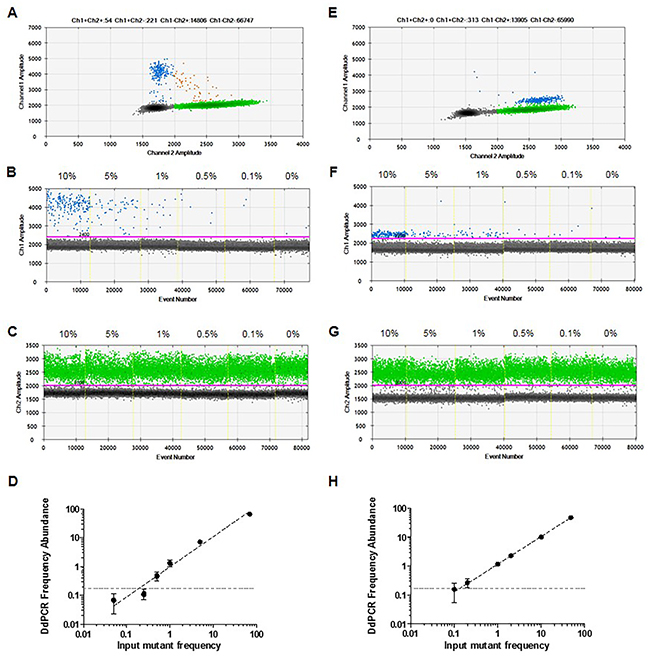 Figure 3: Detection of TERT promoter mutations in the presence of homologous wild-type DNA. Serial dilutions of DNA from mutant cell lines 1205Lu – C228T (A-D) and UACC62 – C250T (E-H) were prepared in a constant background of wild-type human genomic DNA. 2D plots of ddPCR read out at 10% of mutant DNA (A and E). 1D plots indicating mutant (B and F) and wild-type (C and G) DNA detection. Analytical sensitivity (LOD) of the assay (D and H). Obtained frequency abundances and standard deviations were plotted versus expected mutant frequencies based on input. The LOD, defined as 2 SD over the mean frequency abundance obtained at 0% when only wild-type DNA was used as input, was indicated as dashed lines in both graphs.