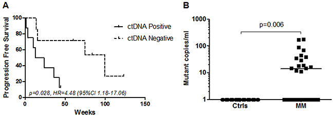 Sensitivity and specificity of the assay was calculated using a contingency table analyzed using a Fisher’s exact test. Comparison between ctDNA concentrations in patient and control samples were performed using the non-parametric Mann-Whitney U-test. A Cox proportional hazards regression analysis was performed to examine association of ctDNA detection with PFS. Statistical analyses were performed using Statistical Package for Social Sciences for Window version 22 (SPSS, Chicago, IL) and plotted using GraphPad Prism version 5.