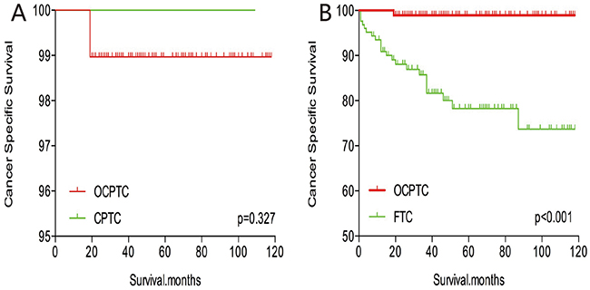 Figure 2: Kaplan Meier curves of cancer-specific mortality for matched subtype pairs. Age, sex and race matching between OCPTC and CPTC (A), OCPTC and FTC (B) patients.